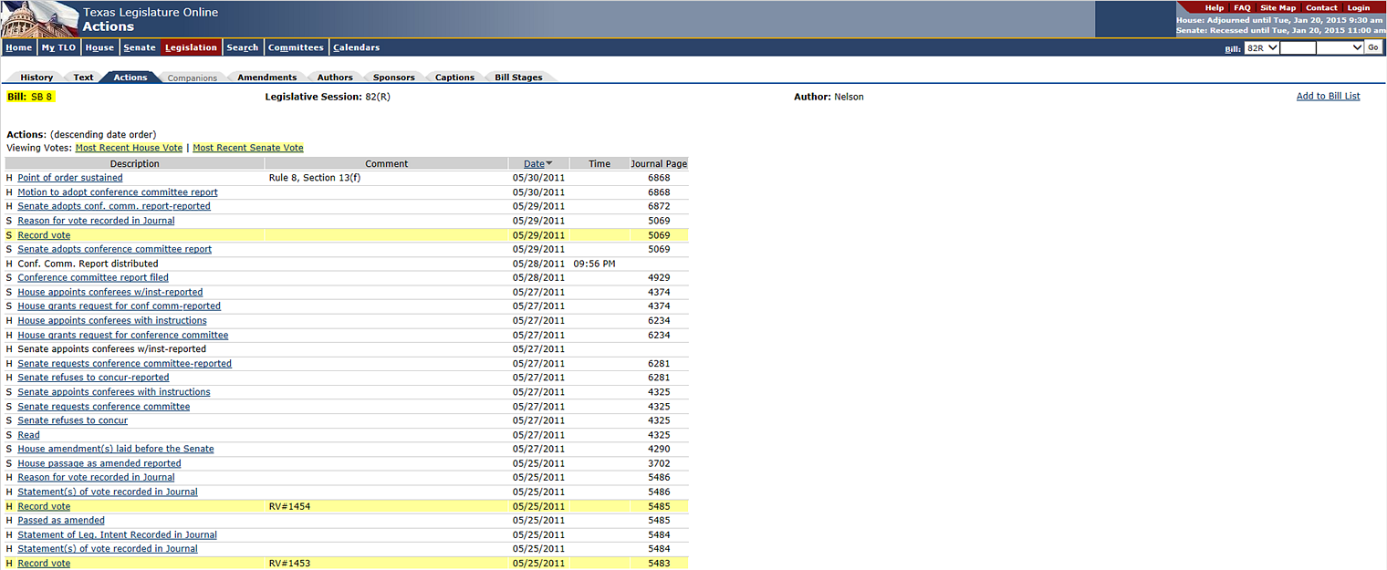 Click the Most Recent House Vote or Most Recent Senate Vote link to move to the most recent house or senate Record Vote action. Click the action link to display the PDF of the journal containing the vote information.