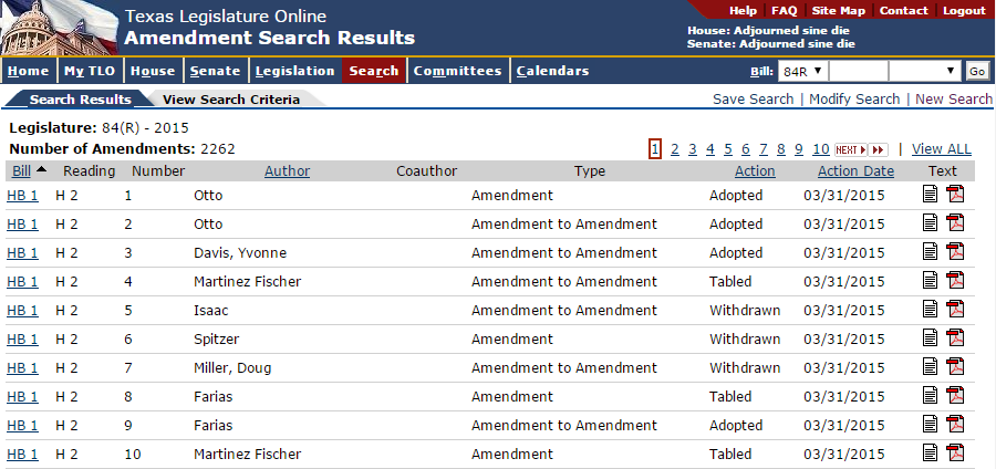 TIP: If the results are more than one page, click the View ALL link to view all the amendments that match the search criteria.