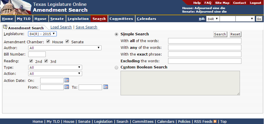 Use the Amendment Search feature to search for amendments by chamber, author, bill number, reading, amendment type, action, specific date range, or text.