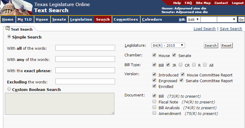 Use the Text Search feature to search bill text and related documents with certain text and bill criteria.