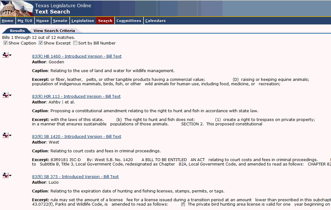 The bills that match the text search criteria are displayed on the Results tab. The Results tab displays the Bill Number, Version, Author, latest Caption, and an Excerpt from the bill text.