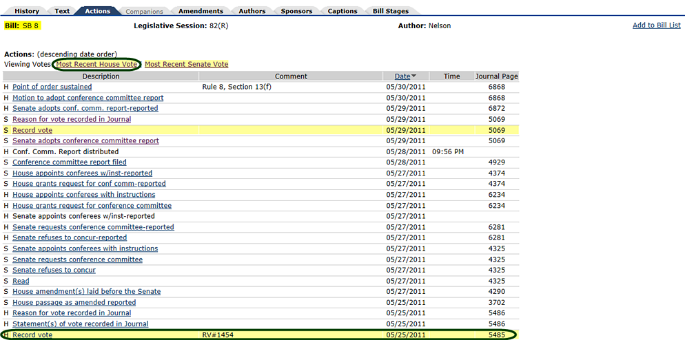NOTE: (1) For the 79th Legislature, record vote information is available for final passage votes. If a record vote was not taken on final passage, the Most Recent House Vote link will not display. (2) If no record votes were taken on a bill in a legislature following the 79th Legislature, the Most Recent House Vote link will not display.